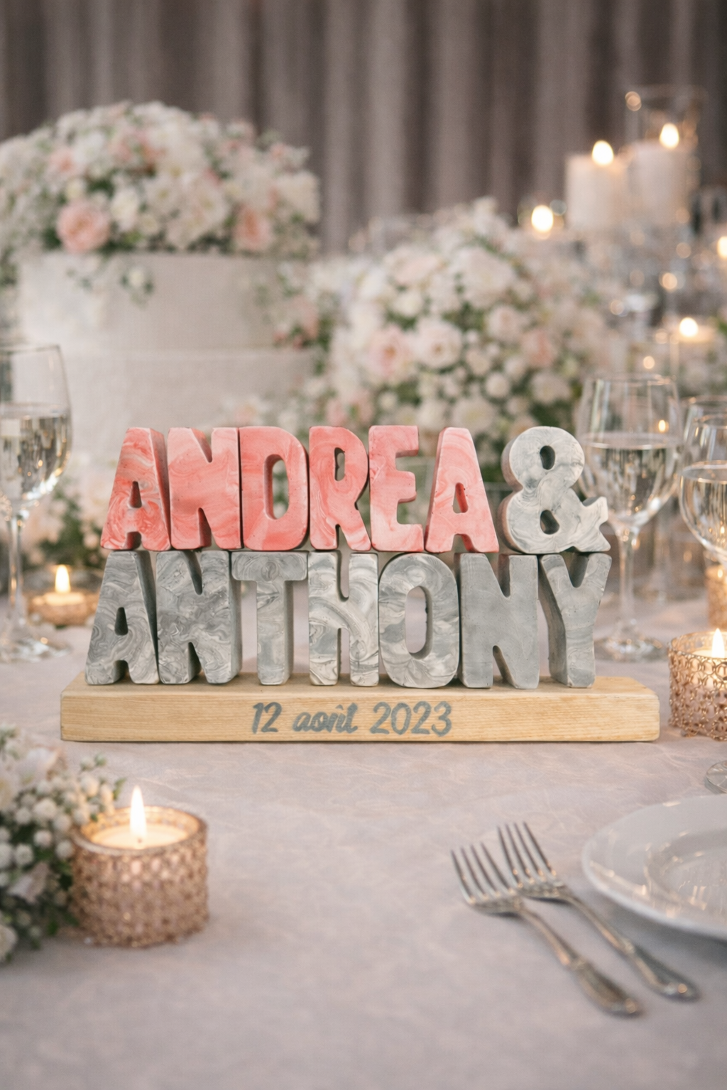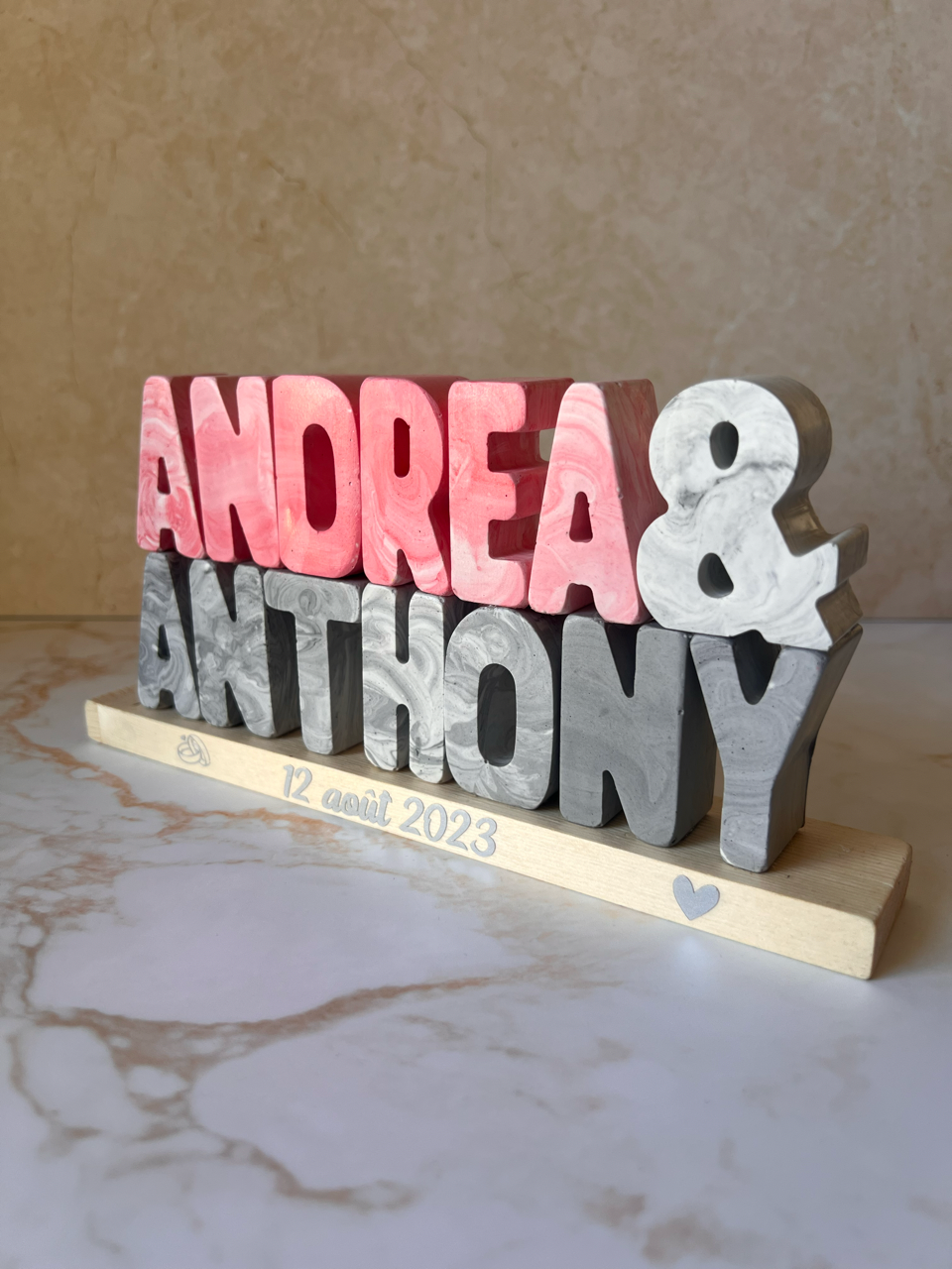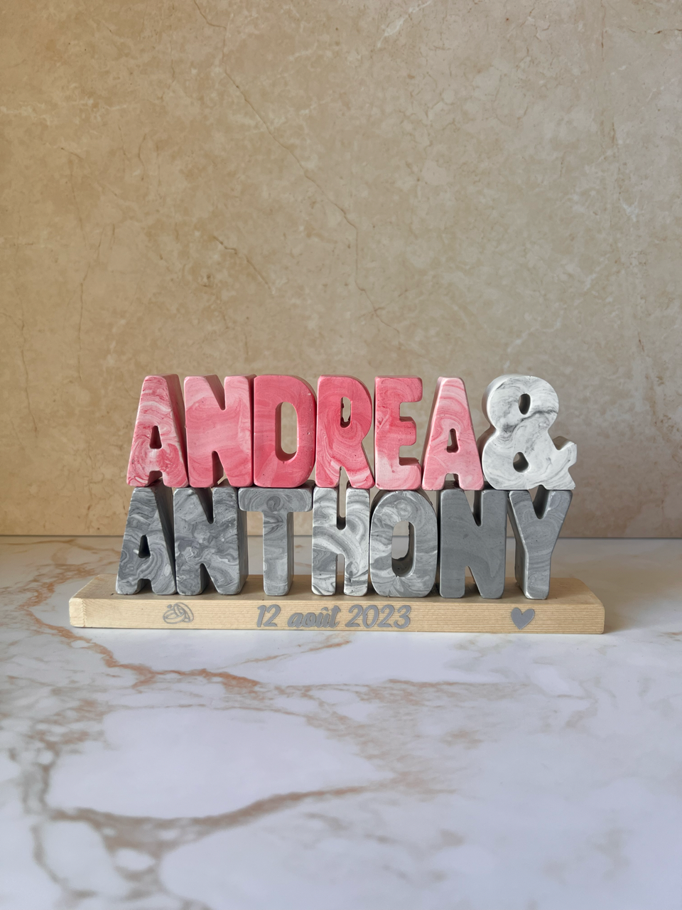 Célébrez votre union avec ce support à prénoms personnalisé en Jesmonite, entièrement fabriqué à la main avec un délicat effet marbré. Personnalisable avec les prénoms des mariés, la date du mariage et les couleurs de votre choix, il devient un souvenir unique et intemporel de votre grand jour. Chaque pièce est réalisée artisanalement, rendant chaque création unique grâce aux nuances marbrées propres à la jesmonite. Idéal comme cadeau de mariage, décoration de table ou souvenir à exposer, ce support trouvera naturellement sa place dans votre intérieur. Support en bois, 15mm d'épaisseur . Une lettre, 14,7mm de hauteur. La longueur dépend de la taille du prénom.
